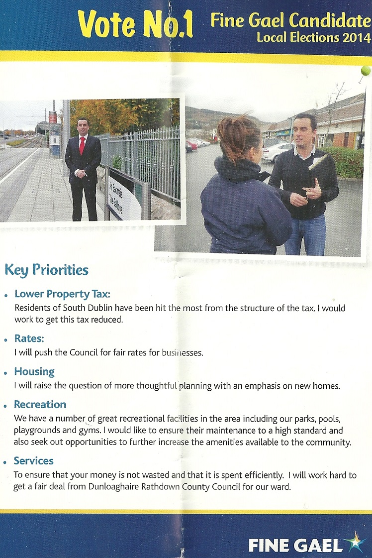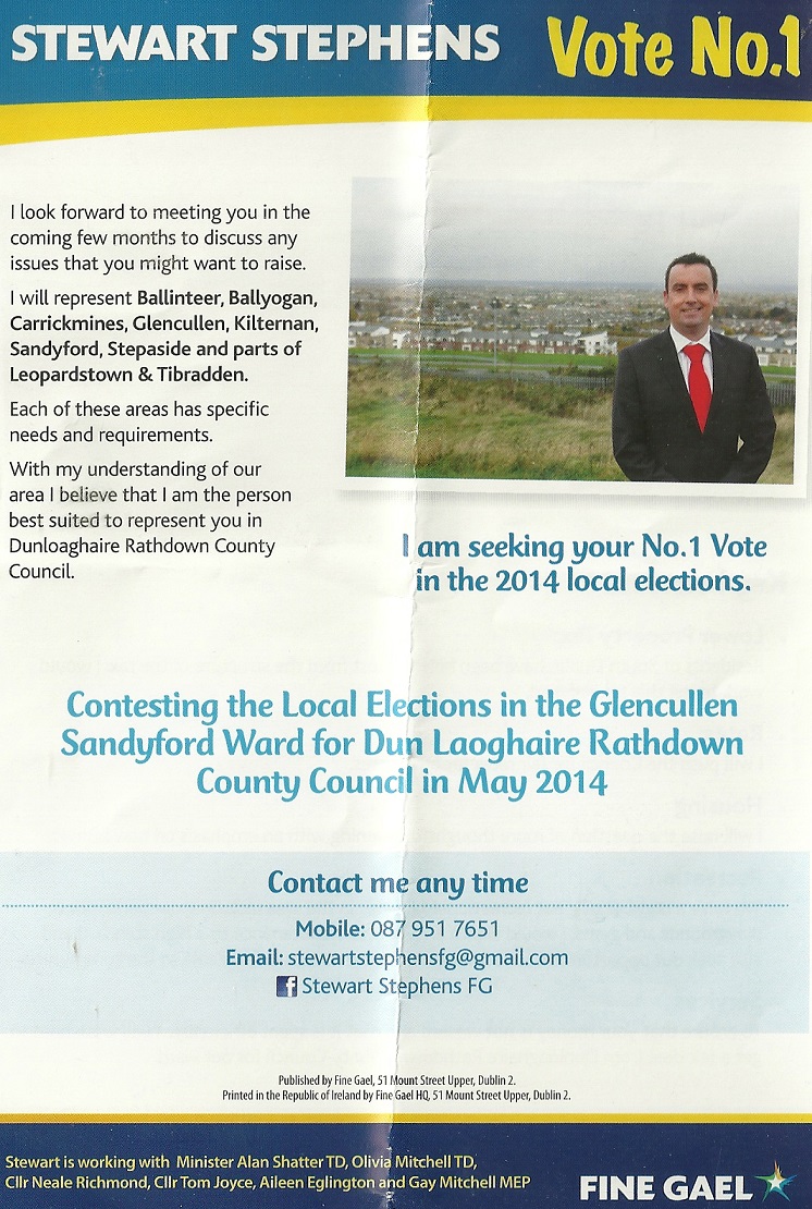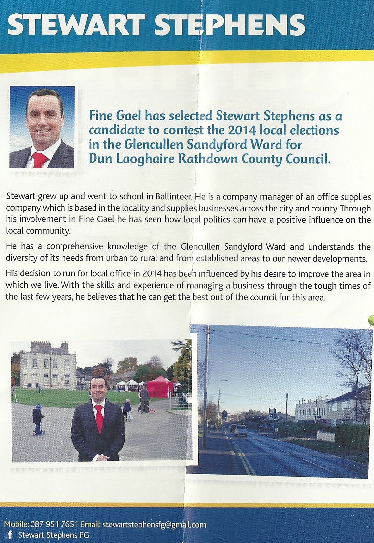 A leaflet from Stewart Stephens who is running for Fine Gael in Glencullen Sandyford for a seat on Dun Laoghaire Rathdown County Council.