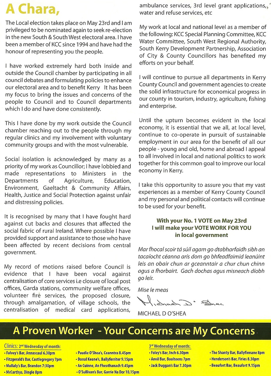 Leaflet from Michael D. O’Shea -Fianna Fail – South and West Kerry -2014 Local Elections » mdoshea2