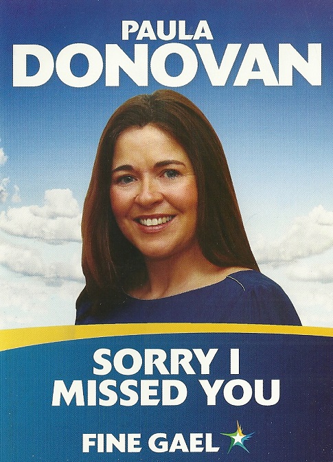 A leaflet and “Sorry I Missed You” card from Paula Donovan who is running for Fine Gael in Rathfarnham for a seat on South Dublin County Council.