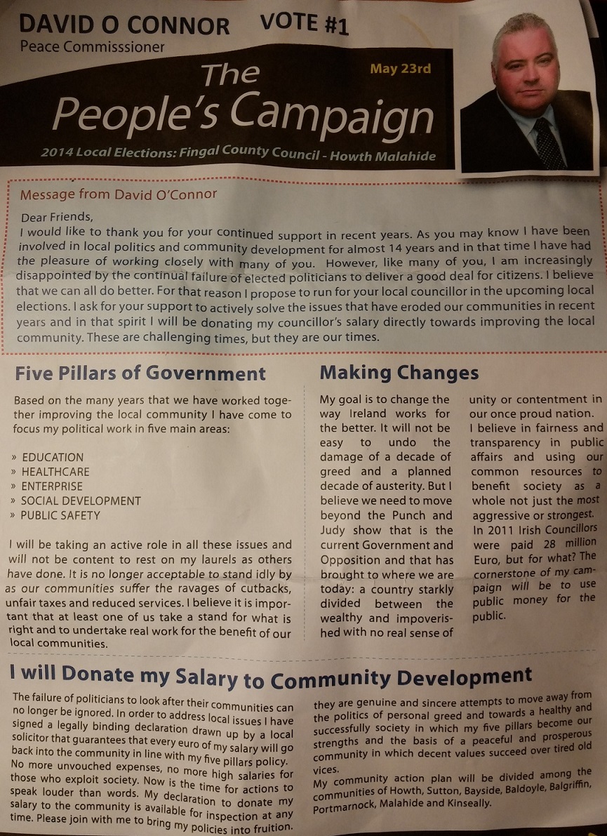 Leaflet from David O’Connor -Independent -Howth Malahide -2014 Local Elections » doconnor1