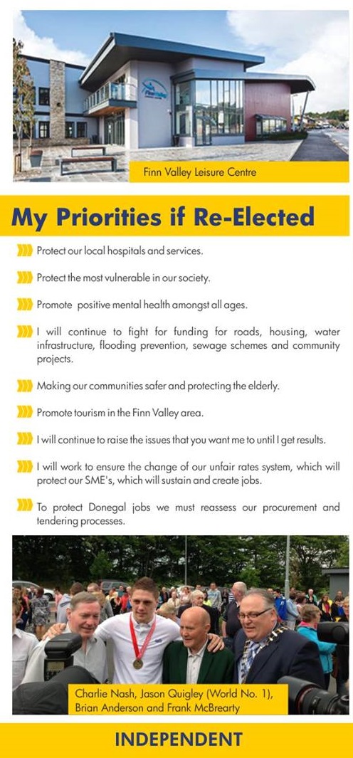A leaflet from former Labour Councillor Frank McBrearty Junior who is running as an Independent in Stranorlar for a seat on Donegal County Council.