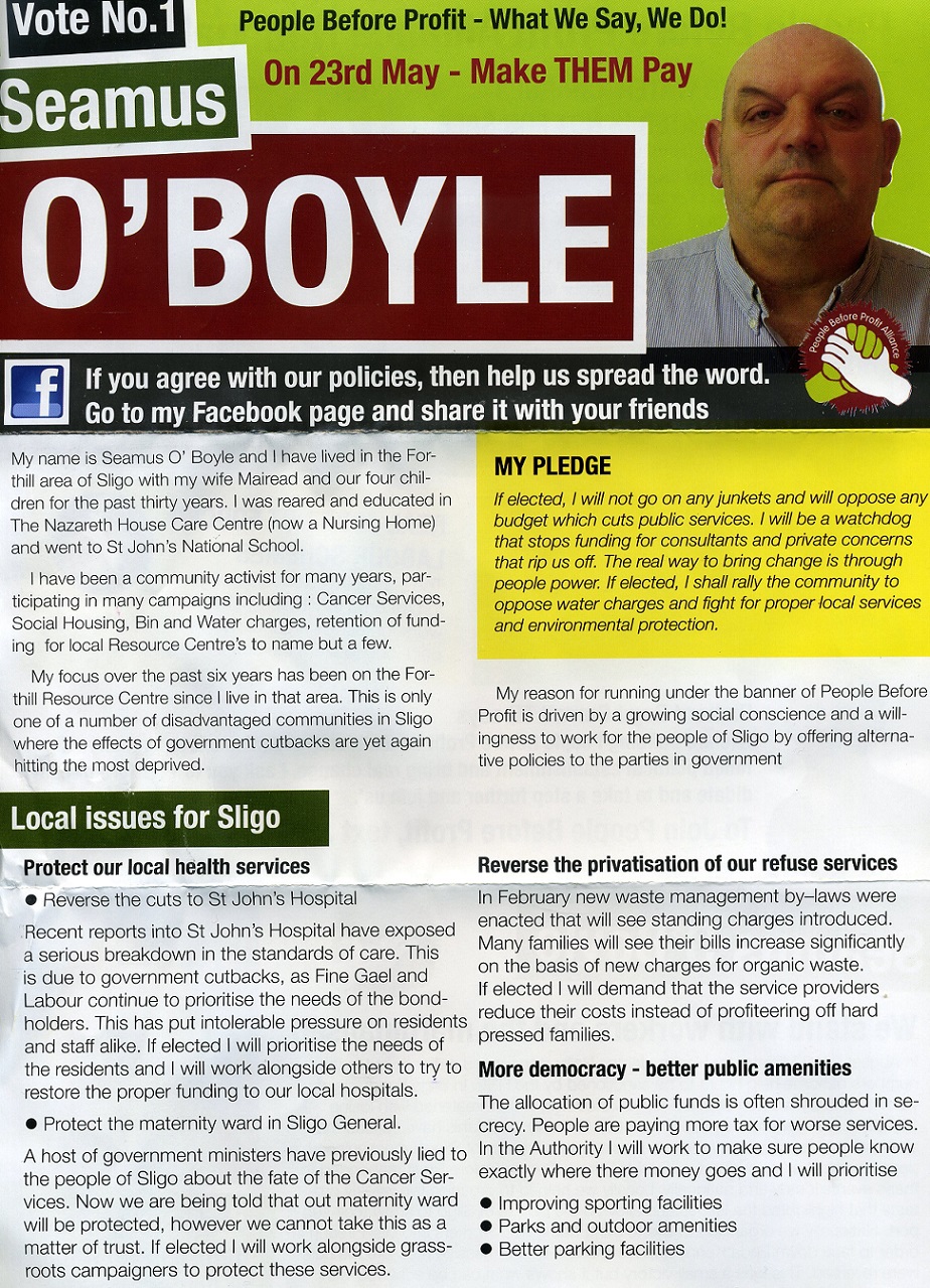 Leaflet from Seamus O’Boyle -People Before Profit – Sligo -2014 Local Elections » seamusoboyle1