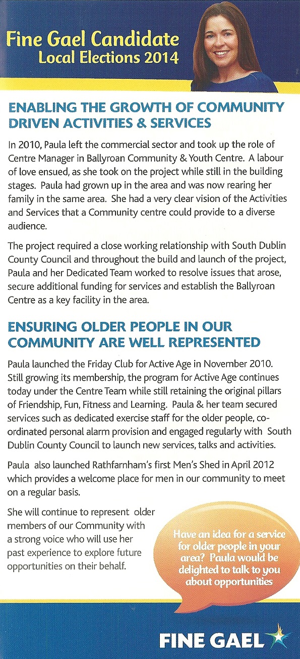 A second campaign leaflet from Paula Donovan who is running for Fine Gael in Rathfarnham.