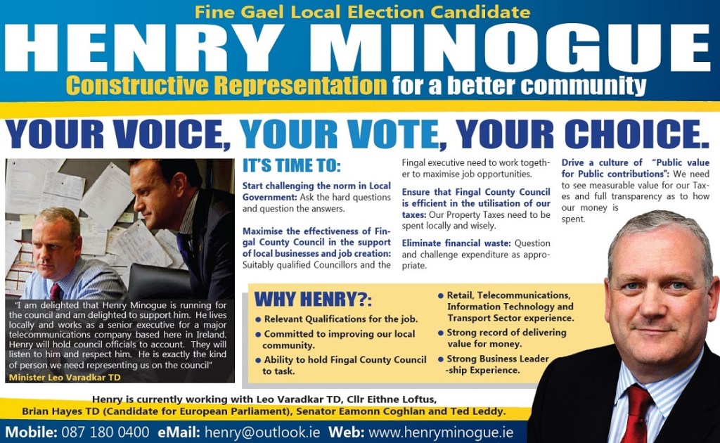 Ad and pitch side advertisment from Henry Minouge -Fine Gael -Castleknock » hminogueadsomerton1a
