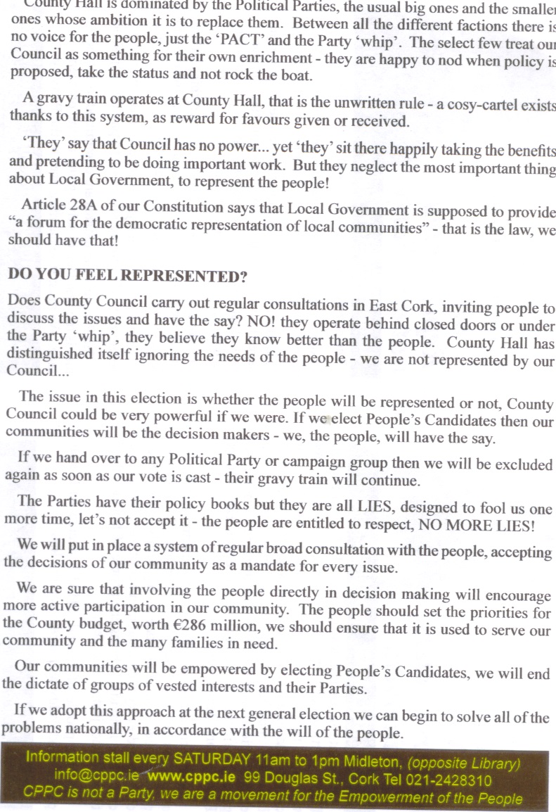 A leaflet from Aisling Murray who is running as a People’s Candidate (CPPC) in East Cork for a seat on Cork County Council.