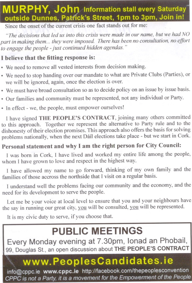 Leaflet from John Murphy -People’s Candidate (CPPC) -Cork North West -2014 Local Elections » JohnMurphyFlyer2