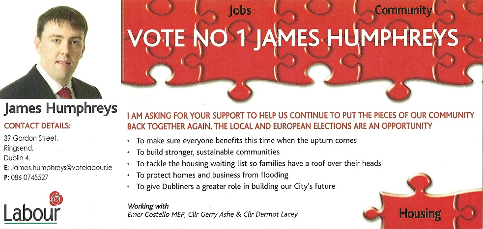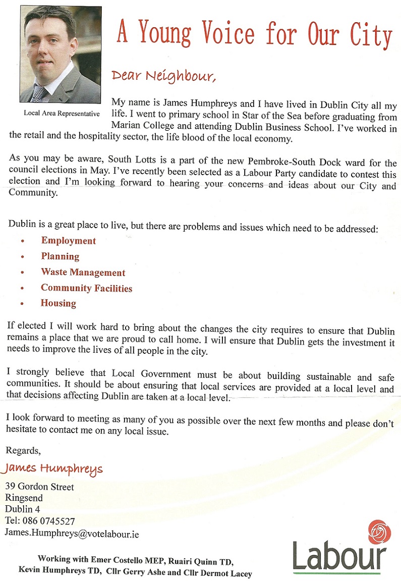 A flyer and letter to voters from James Humphreys who is running for The Labour Party in Pembroke South Dock for a seat on Dublin City Council.