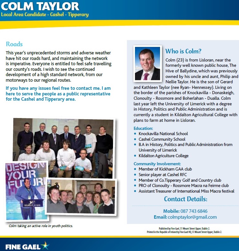 New leaflet from Colm Taylor -Fine Gael – Cashel Tipperary -2014 Local Elections » ctaylornew3