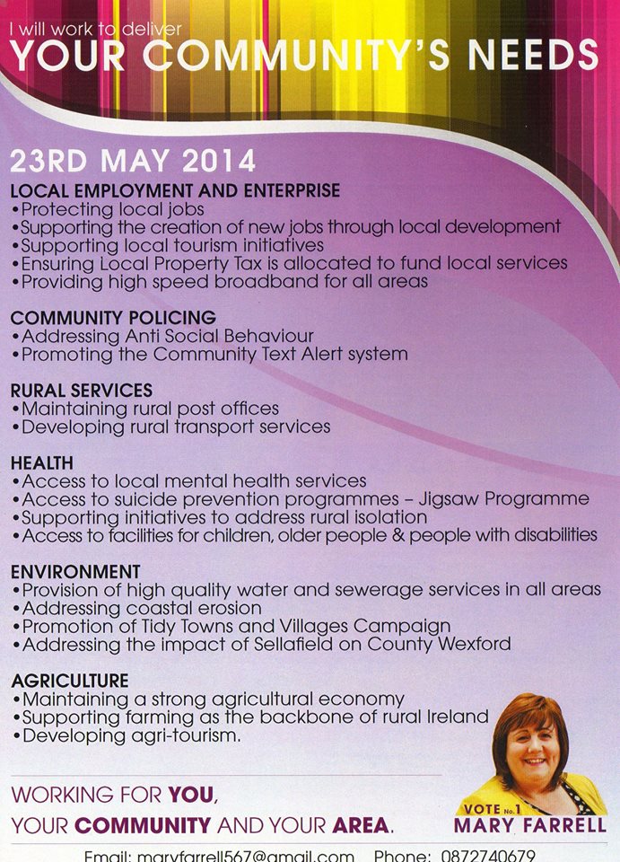 A leaflet from Mary Farrell who is running as an Independent in Gorey for a seat on Wexford County Council.