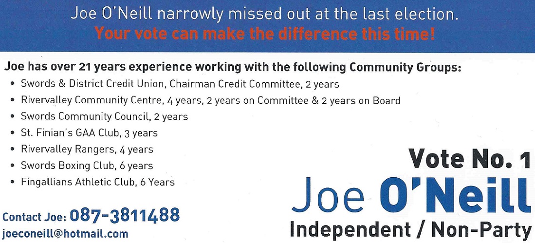 A leaflet for Joe O’Neill who is running as an Independent in Swords for a seat on Fingal County Council.