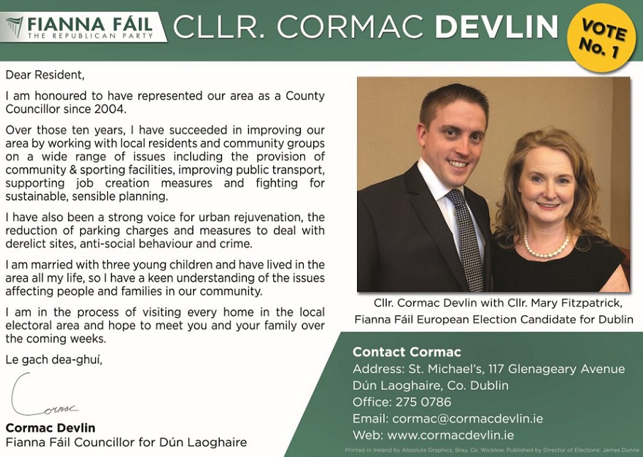 Leaflet from Cormac Devlin -Fianna Fail -Dun Laoghaire -2014 Local Elections » C.Devlin A5 – Rear