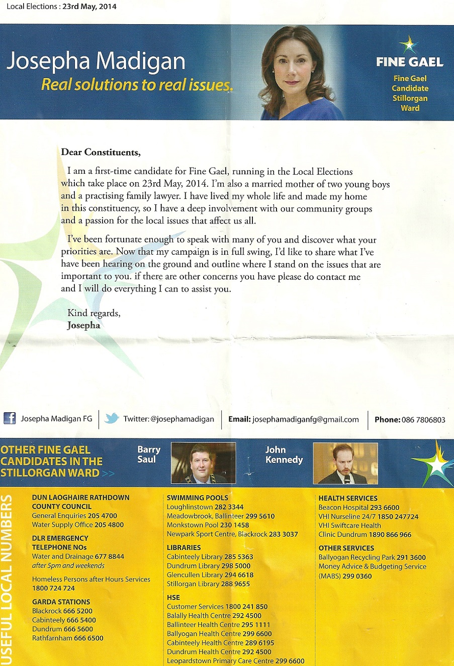 A newsletter covering a number of local issues from Fine Gael candidate Jospeha Madigan who is running in Stillorgan for a seat on Dun Laoghaire Rathdown County Council.