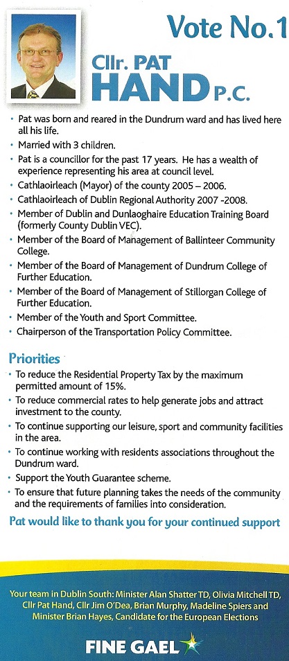 Leaflet from Pat Hand – Fine Gael -Dundrum -2014 Local Elections » phand2