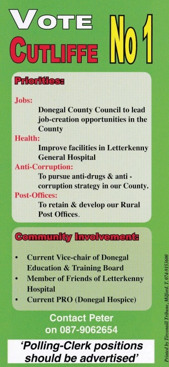 A flyer from Peter Cutliffe, who is the former Chairman of the Labour Party in Donegal , who quit the party to run as an Independent in Letterkenny for a seat on Donegal County Council.