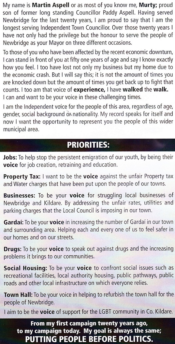 A leaflet from Murty Aspell who is running as an Independent in Kildare Newbridge for a seat on Kildare County Council.