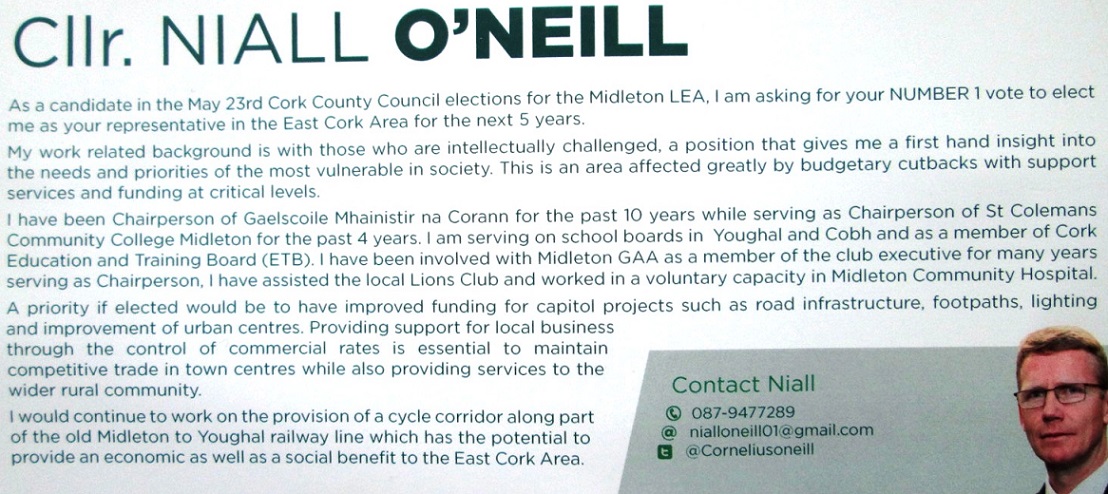 A leaflet from Niall O’Neill who is running for Fianna Fail in East Cork for a seat on Cork County Council.