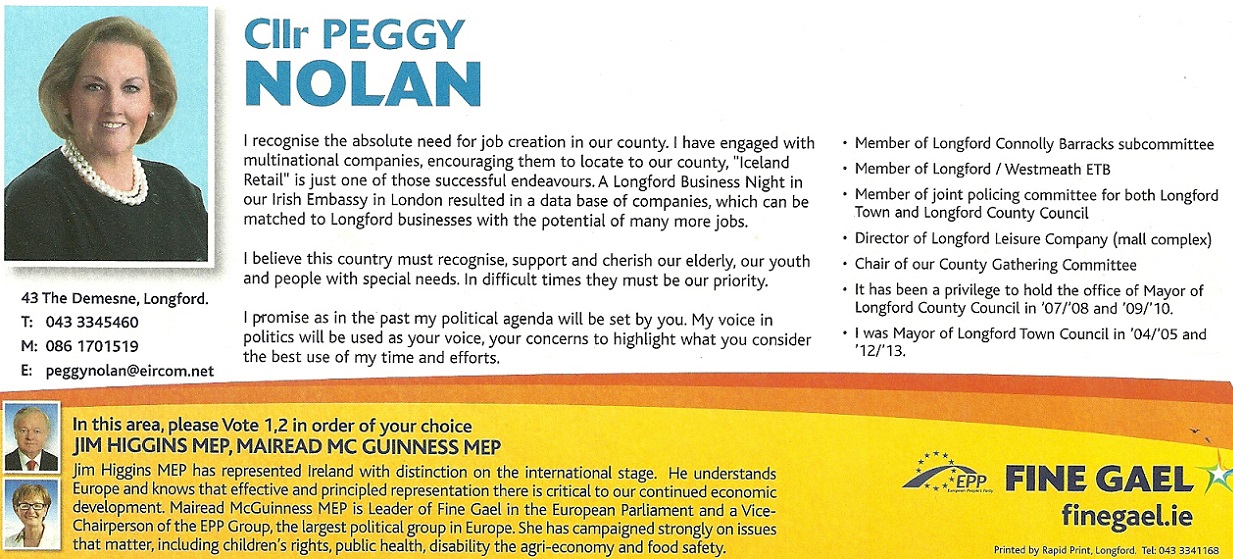 A leaflet from Peggy Nolan who is running for Fine Gael in the Longford LEA for a seat on Longford County Council.