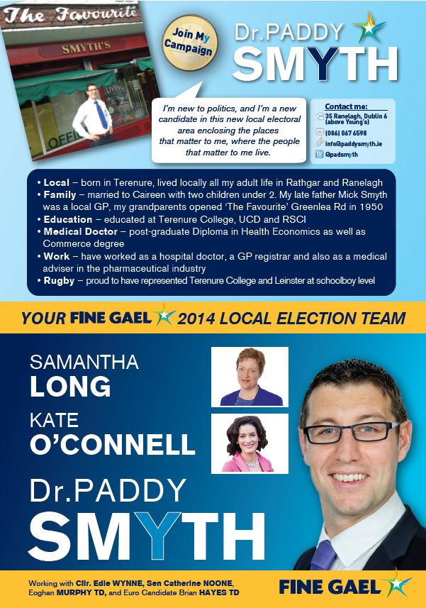 A “Vote 1” leaflet from Paddy Smyth from Paddy Smyth who is running for Fien Gael in Rathgar Rathmines for a seat on Dublin City Council.