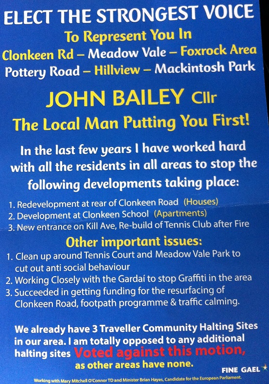 Two Leaflets from John Bailey running for Fine Gael in Dun Laoghaire, taking credit for blocking several housing developments and reminding residents of his anti-Traveller credentials.