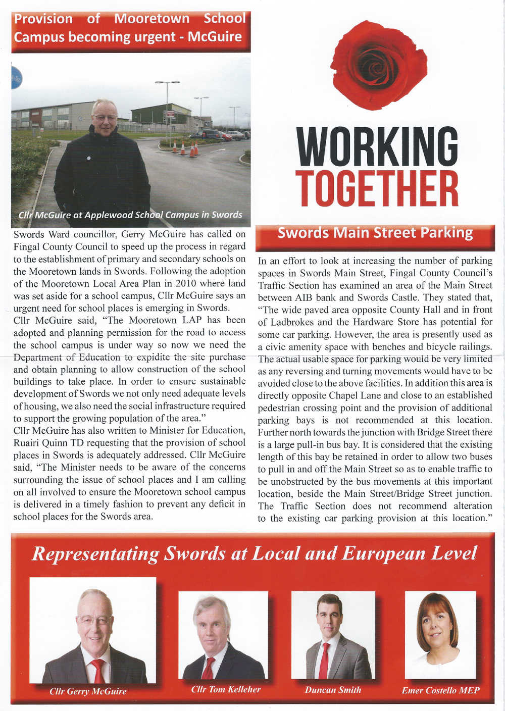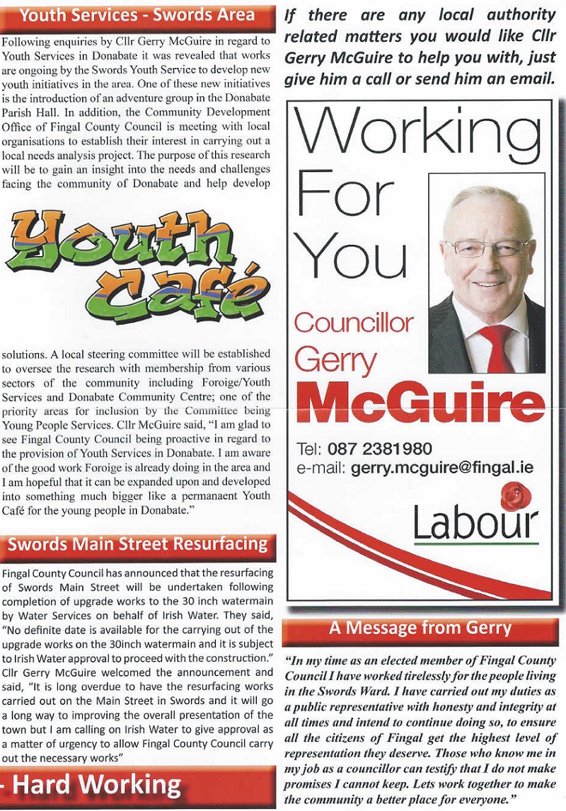 “Tried- Tested -Trusted – Official Newsletter of Cllr Gerry McGuire” . Gerry McGuire is running for Labour in Swords for a seat on Fingal County Council.
