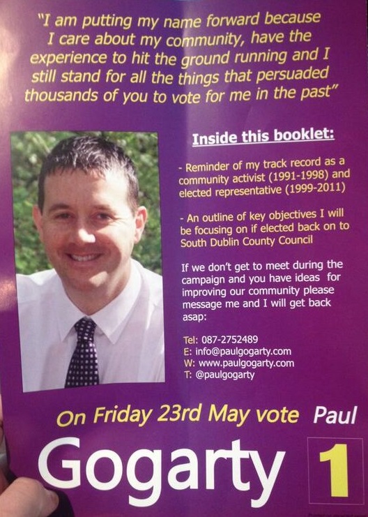 A flyer from former Green Party TD Paul Gogarty who is running as an Independent in Lucan for a seat on South Dublin County Council.