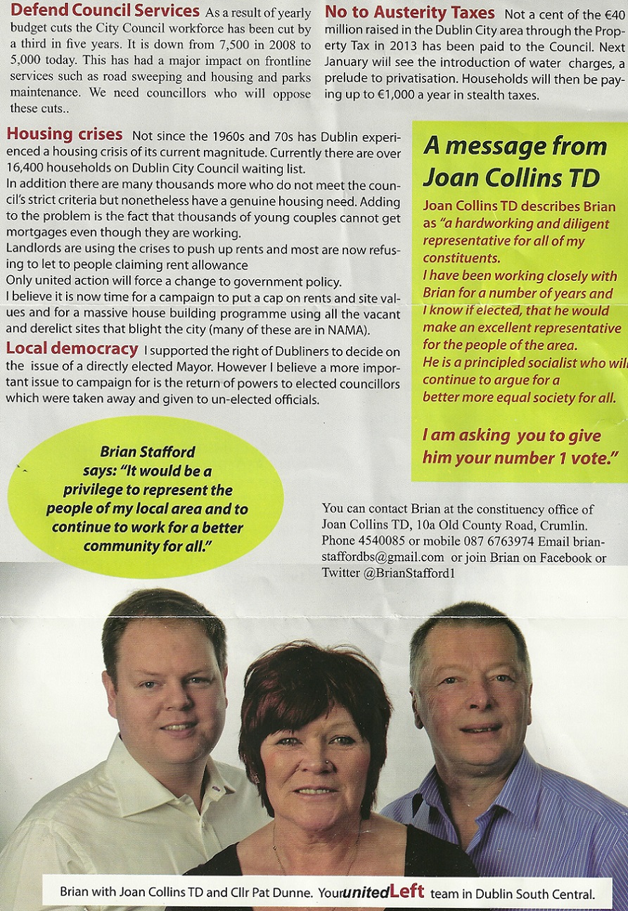 A Leaflet from United Left candidate Brian Stafford who is running in the Ballyfermot-Drimnagh Ward for a seat on Dublin City Council.