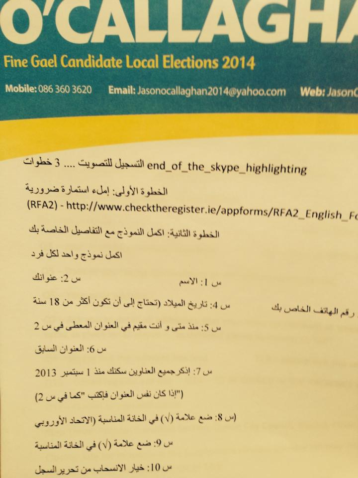 Voter Registration leaflet in Arabic from Jason O’Callaghan -Fine Gael -Crumlin Kimmage » arabic