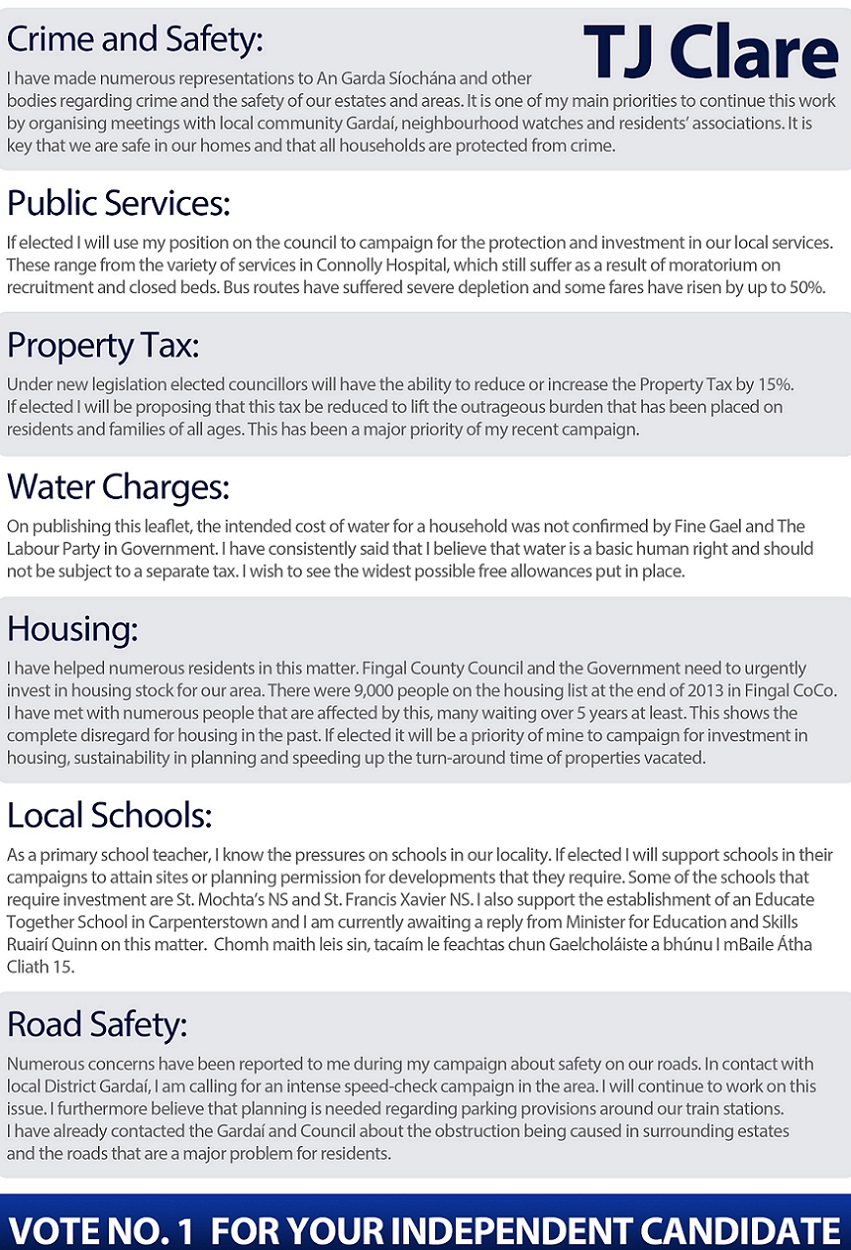 Leaflet for TJ Clare -Independent – Castleknock -2014 Local Elections » tjclare2