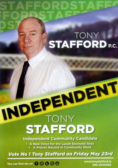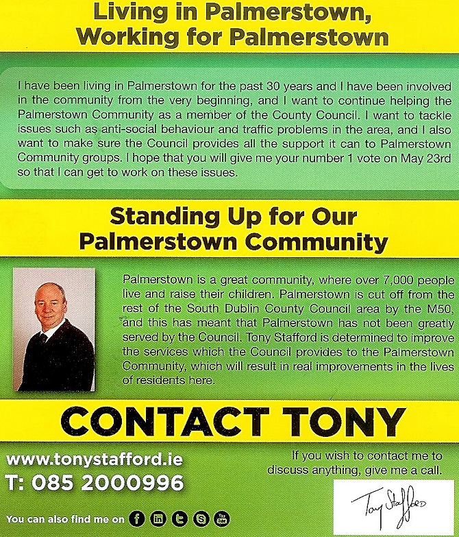 A leaflet for Lucan and one for Palmerstown from Tony Stafford who is running as an Independent candidate in Lucan for a seat on South Dublin County Council.