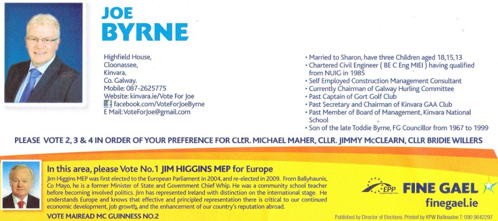 Canvass Card for Joe Byrne – Fine Gael -Loughrea -2014 Local Elections » le14joebyrnefgback