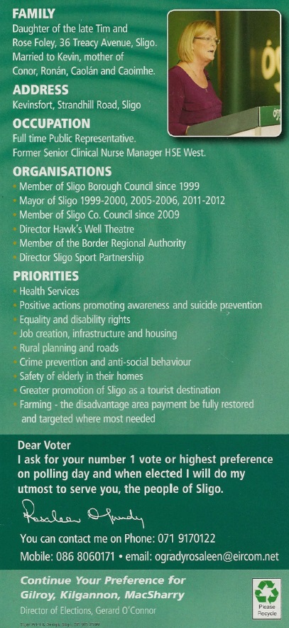Canvass Card from Rosaleen O’Grady -Fianna Fail -Sligo -2014 Local Elections » rogrady2