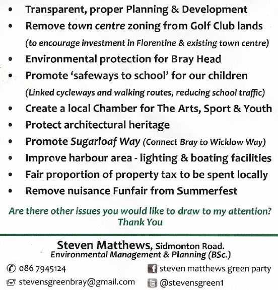 A leaflet from Steven Matthews who is running for The Green Party in Bray for a seat on Wicklow County Council.