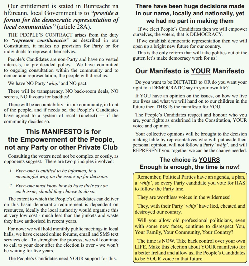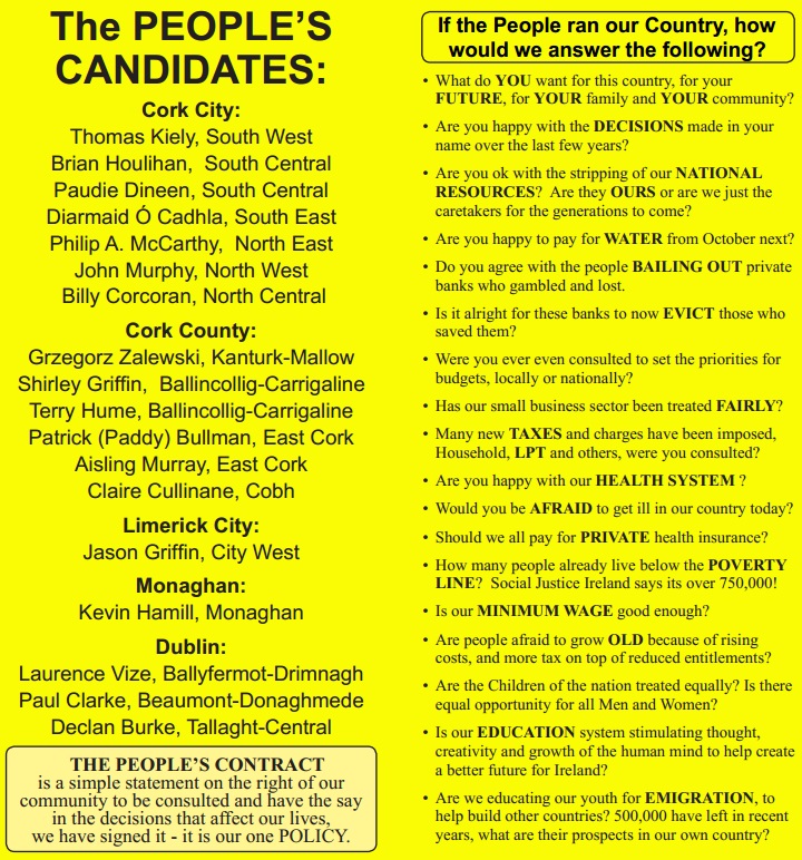 A Statement of the “People’s Candidates” leaflet listing details of what they stand for and listing the candidates themselves and where they are standing.