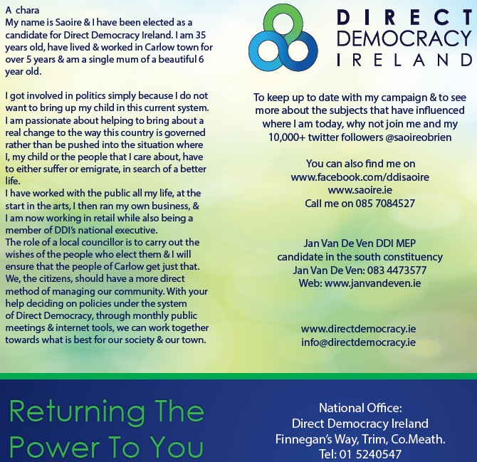 Leaflet from Saoire O’Brien -Direct Democracy Ireland – Carlow -2014 Local Elections » sobriena2