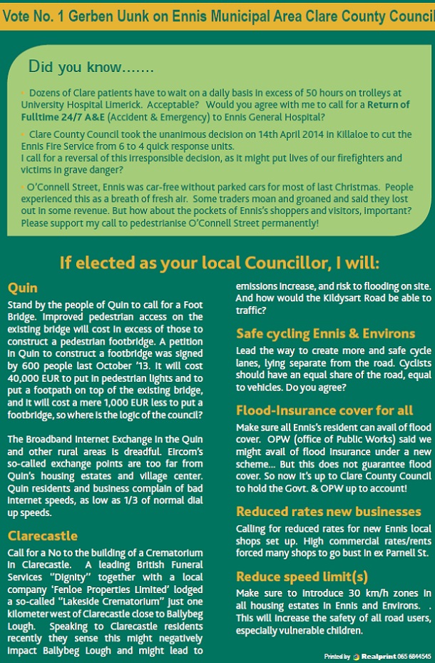 A leaflet from Gerben Uunk who is running for the Green Party in Ennis for a seat on Clare County Council.