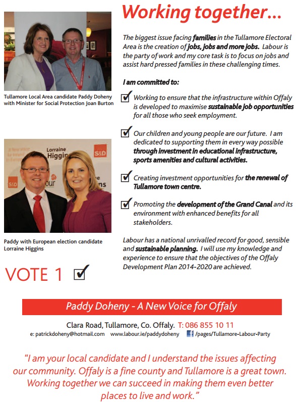 A leaflet from Paddy Doheny who is running for Labour in Tullamore for a seat on Offaly County Council.