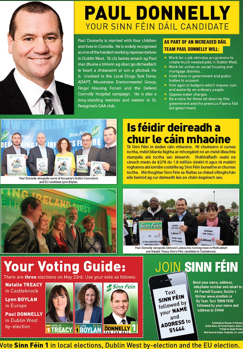 Leaflet from Paul Donnelly -Sinn Fein -Dublin West By Election » pdonnelly2