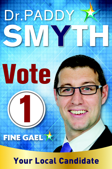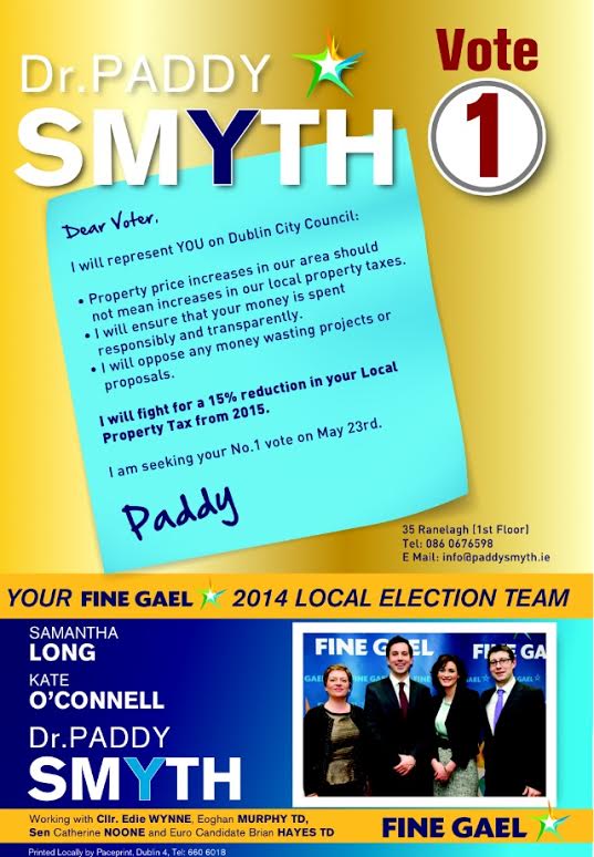 A final flyer from Paddy Smyth who is running for Fine Gael in Rathgar Rathmines for a seat on Dublin City Council. I gather there are different versions tailored towards each area like the Terenure one below and a generic ‘Your Local Candidate’.