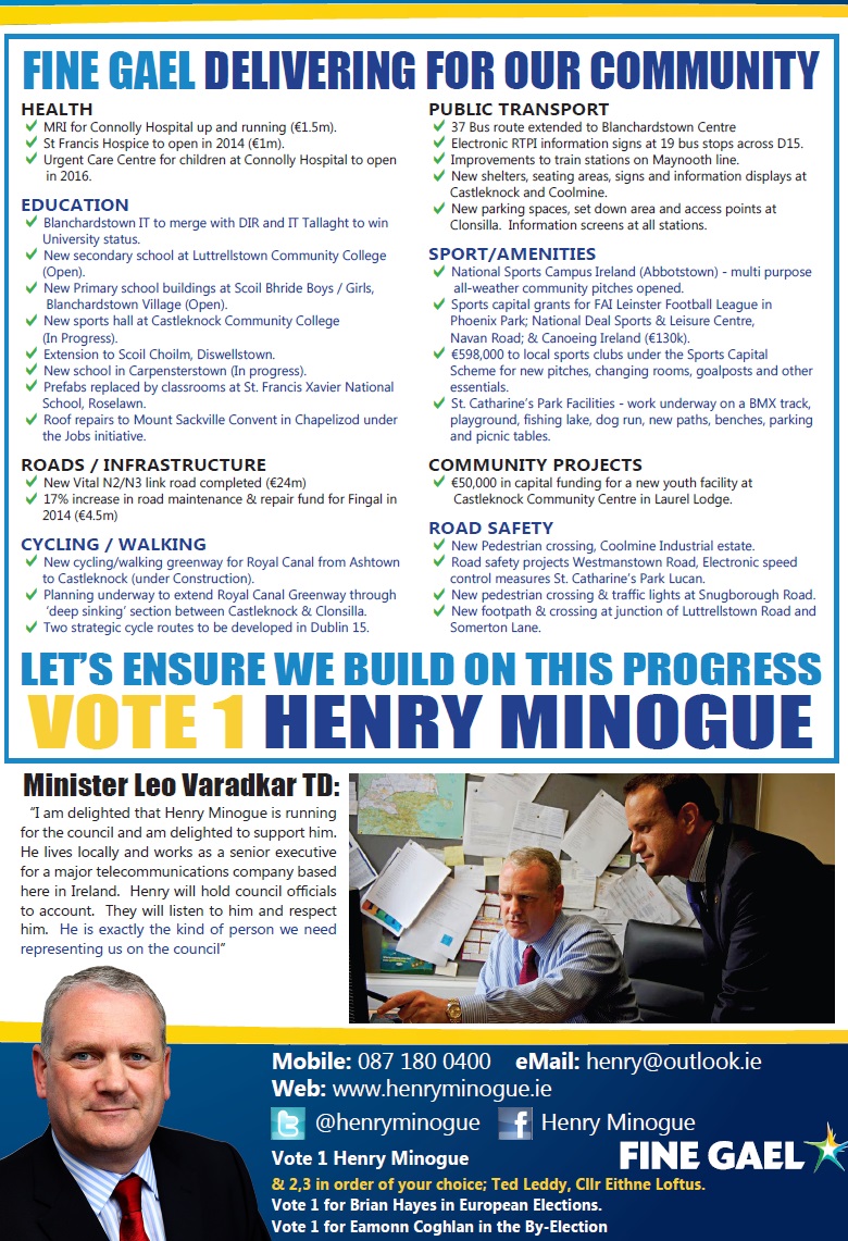 A final pre election leaflet from Fine Gael Castleknock candidate Henry Minogue.