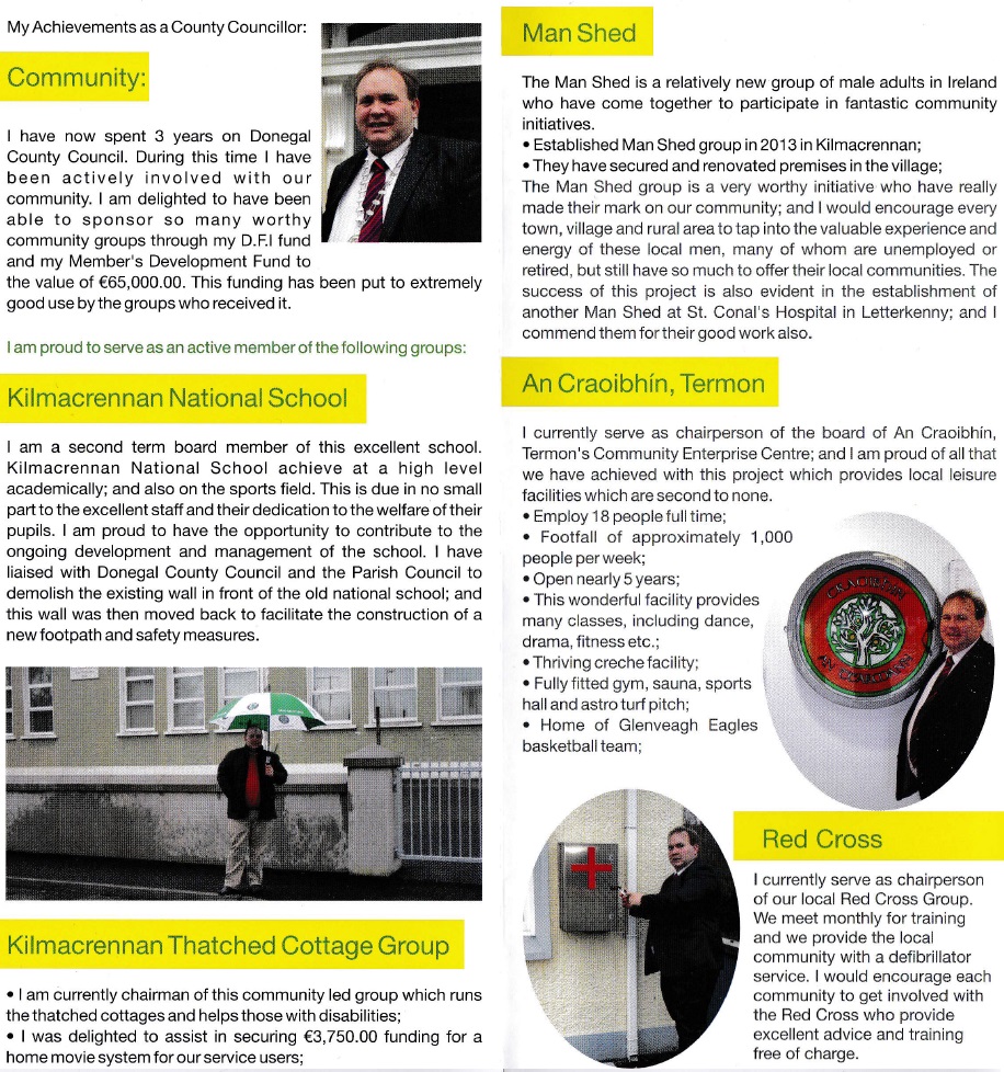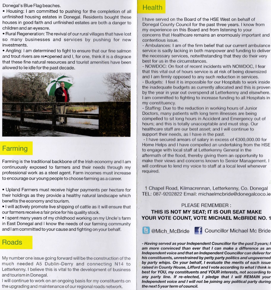 A leaflet from Michael McBride who is running as an Independent in Letterkenny for a seat on Denegal County Council.