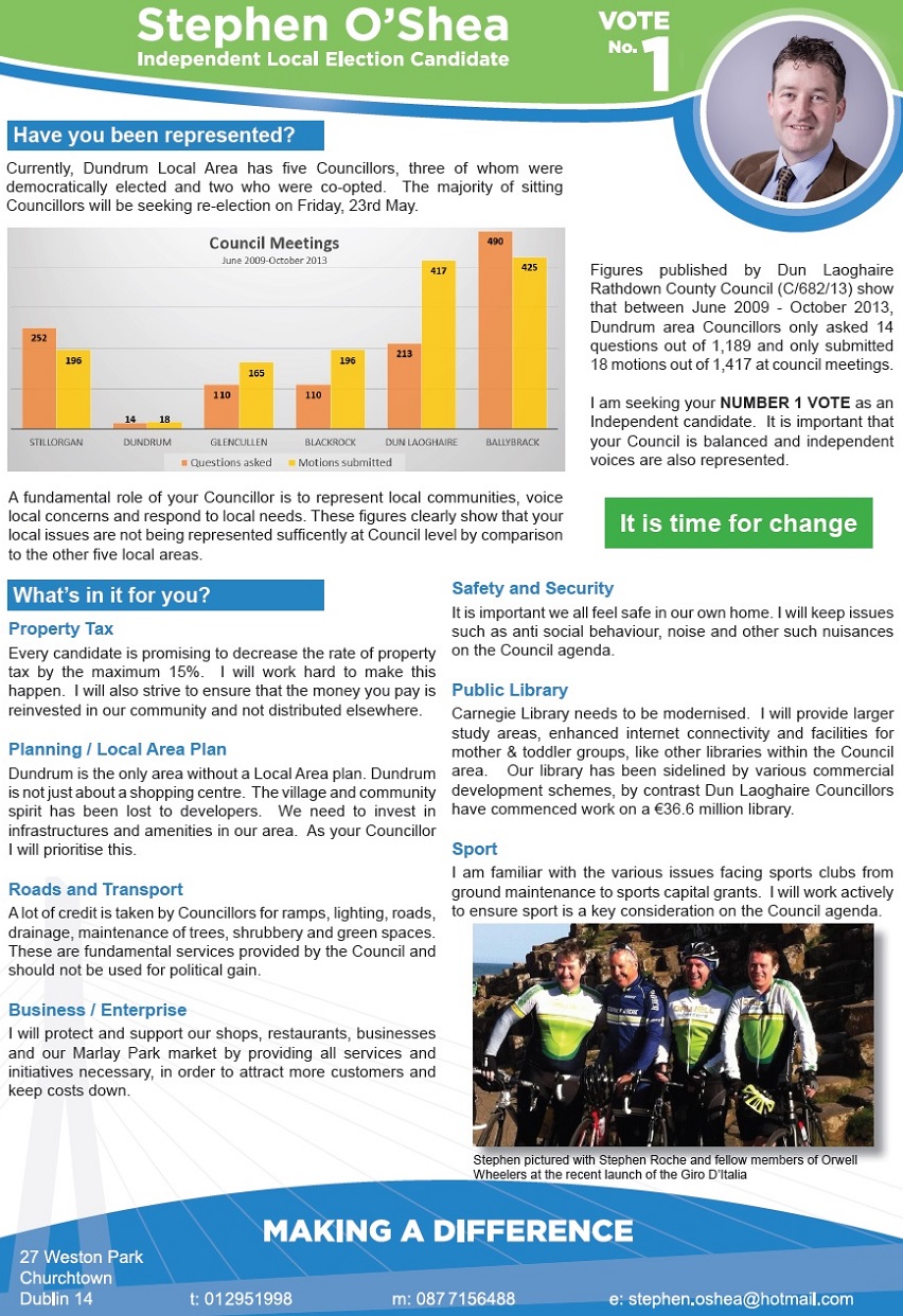 Leaflet from Stephen O’Shea -Independent -Dundrum -2014 Local Elections » soshea1
