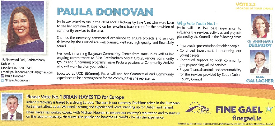 A Canvass Card from Paula Donovan who is running for Fine Gael in Rathfarnham for a seat on South Dublin County Council.