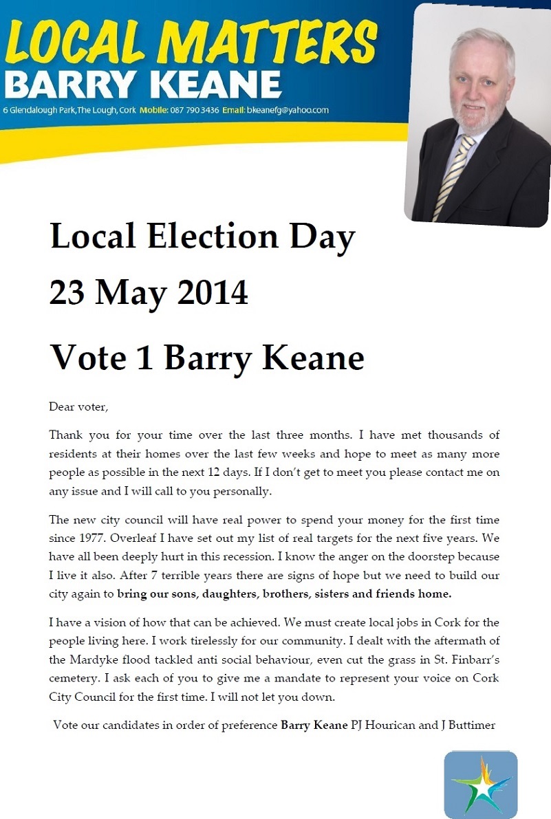 Leaflet from Barry Keane – Fine Gael -Cork City South West – 2014 Local Elections » bkeanel1