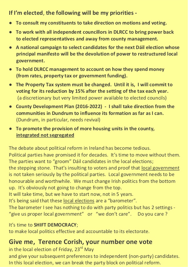 A leaflet from former Green Party Councillor Terence Corish who is running as an Independent in Dundrum for a seat on Dun Laoghaire Rathdown County Council.