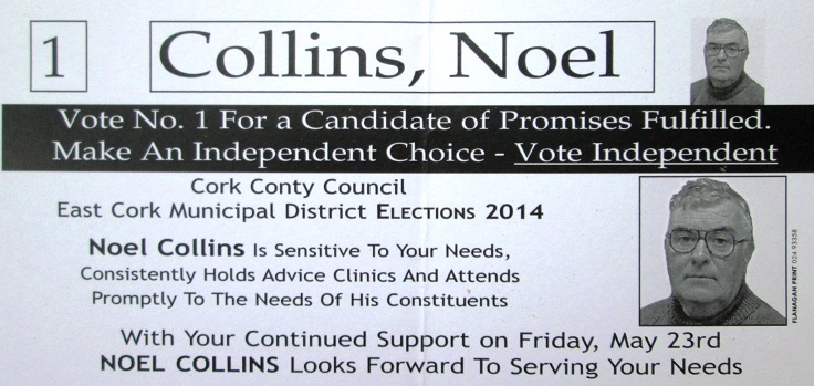 A canvass Card from Noel Collins, the long serving Independent Councillor on both Cork County Council and (the now being abolished) Midleton Town Council.