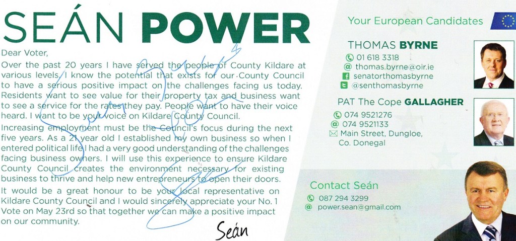 Canvass Card from Seán Power – Fianna Fail -Newbridge Kildare » spower2