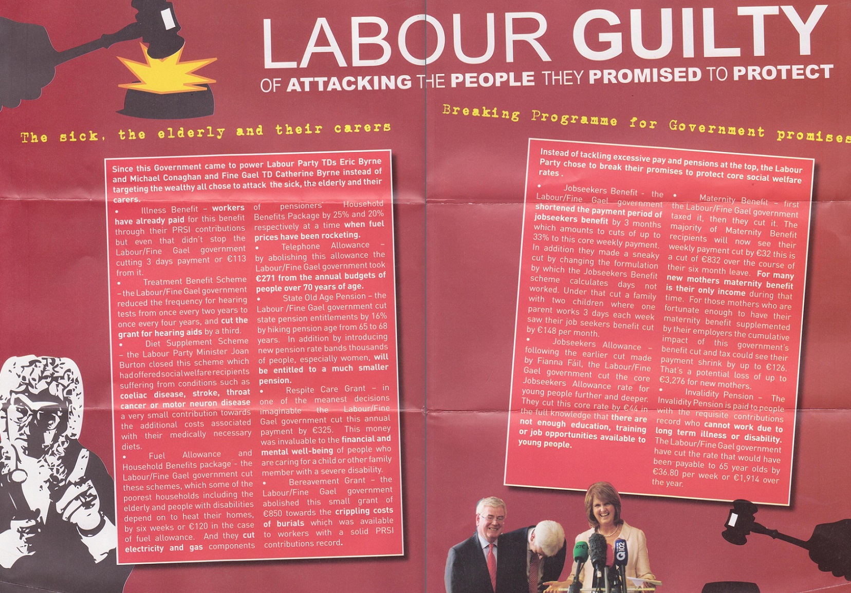 “Labour Guilty of Attacking The People They Promised To Protect” a leaflet from Ray McHugh and Críona Ní Dhálaigh who are running for Sinn Fein in Crumlin Kimmage.