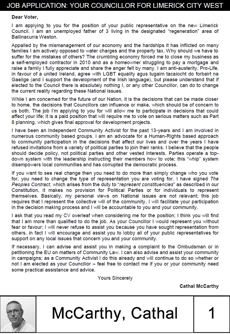 Leaflet from Cathal McCarthy -People’s Candidate (CPPC) -Limerick City West » cmccarthy1