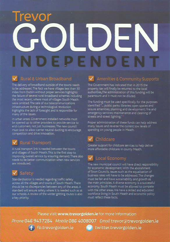 A leaflet from Trevor Golden who is running as an Independent in Trim for a seat on Meath County Council.