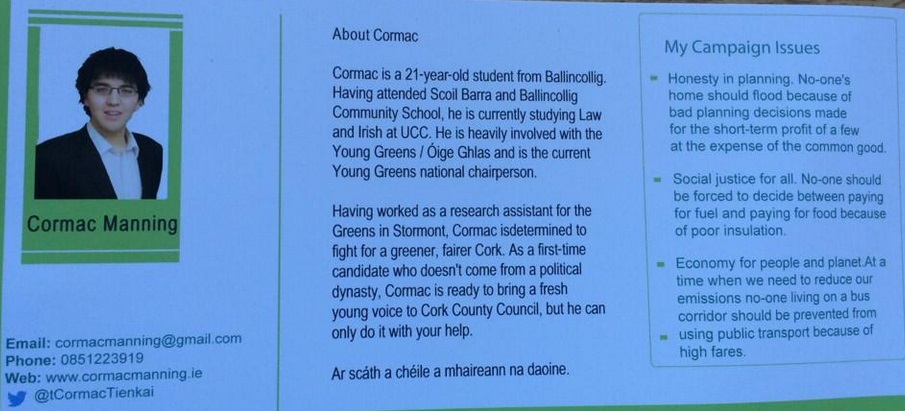 Canvass Card from Cormac Manning -Green Party -Ballincollig Carrigaline -2014 Local Elections » cmanning2